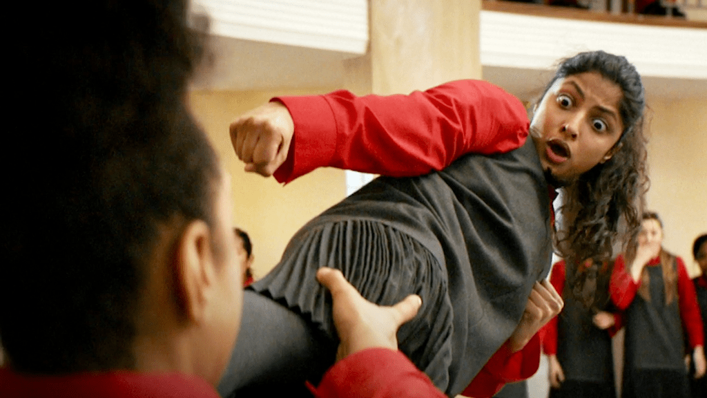 The premise is a good one; high school student Ria (Priya Kansara) wants nothing more than to be a stunt woman. She practices her moves and has her sister Lena (Ritu Arya) video them for her YouTube channel. She takes on school bullies (unsuccessfully) and engages her best friends Clara (Seraphina Beh) and Alba (Ella Bruccoleri) in a number of preposterous schemes. When Lena meets and quickly becomes engaged to the seemingly charming and highly eligible bachelor Salim (Akshay Khanna), Ria straight away clocks that something doesn’t seem right, and makes it her mission to uncover why Salim really wants to marry Ria’s art school dropout sister. Standing in Ria’s way though is the brilliantly sinister Nimra Bucha as Salim’s controlling mother. The hijinks that follow are elaborate and entertaining, but also a little confusing at times.